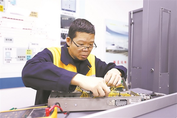 此后3個(gè)月,他每天下班后多留一小時(shí),繪制電路原理圖,推演電路邏輯,常為設(shè)定一個(gè)參數(shù)熬至深夜。為了確定最佳電源電壓,他連續(xù)一周開展測試,數(shù)據(jù)記滿3個(gè)筆記本。沒有專用工具,他就用銼刀、烙鐵手工制作;信號(hào)傳輸不穩(wěn)定,就一次次調(diào)整電路布局。經(jīng)過反復(fù)改進(jìn),他成功搭建起車載設(shè)備室內(nèi)檢修試驗(yàn)平臺(tái)。車間副主任付瑜忠評(píng)價(jià)說:“有了這個(gè)平臺(tái),不用上車就能完成TAX等設(shè)備檢修和模擬試驗(yàn),大幅提升了檢修效率。”